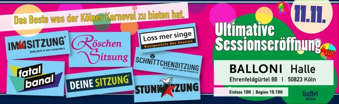 Loss mer Singe, die Immisitzung, die Röschen Sitzung, die Schnittchensitzung, fatal banal, Deine Sitzung und die Stunksitzung wollen gemeinsam mit EUCH den Karnevalsauftakt in den BALLONI Hallen in Köln-Ehrenfeld feiern.